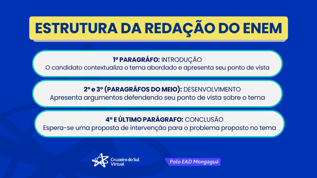 - Conclusão: retome sua ideia central e proponha uma intervenção (lembrando dos 5 elementos exigidos: agente, ação, modo, finalidade e detalhamento).