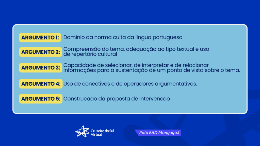 - Competência 1: Domínio da norma culta da Língua Portuguesa (gramática, ortografia, pontuação, etc.).